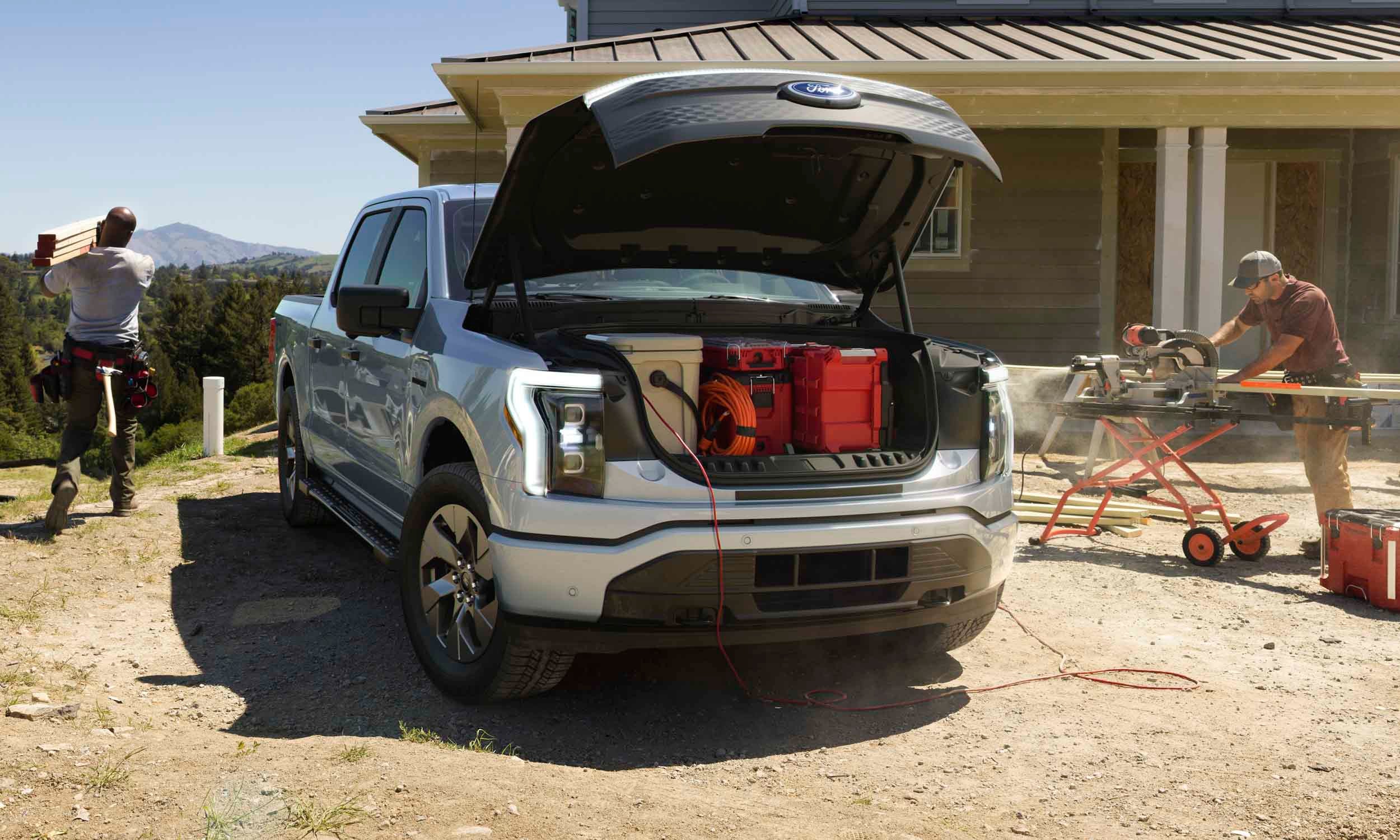 With six standard 120V outlets built into the truck, you can charge your phone, power your tools or plug in anything you need while you’re out and about. Four of these outlets are found in the frunk – or the front trunk – of the truck. Given that EVs don’t need all that room in the front for an engine or other equipment gas-powered cars do, they have more room for storage so you can carry your equipment in the bed of the truck and pack anything else you may need in the frunk!